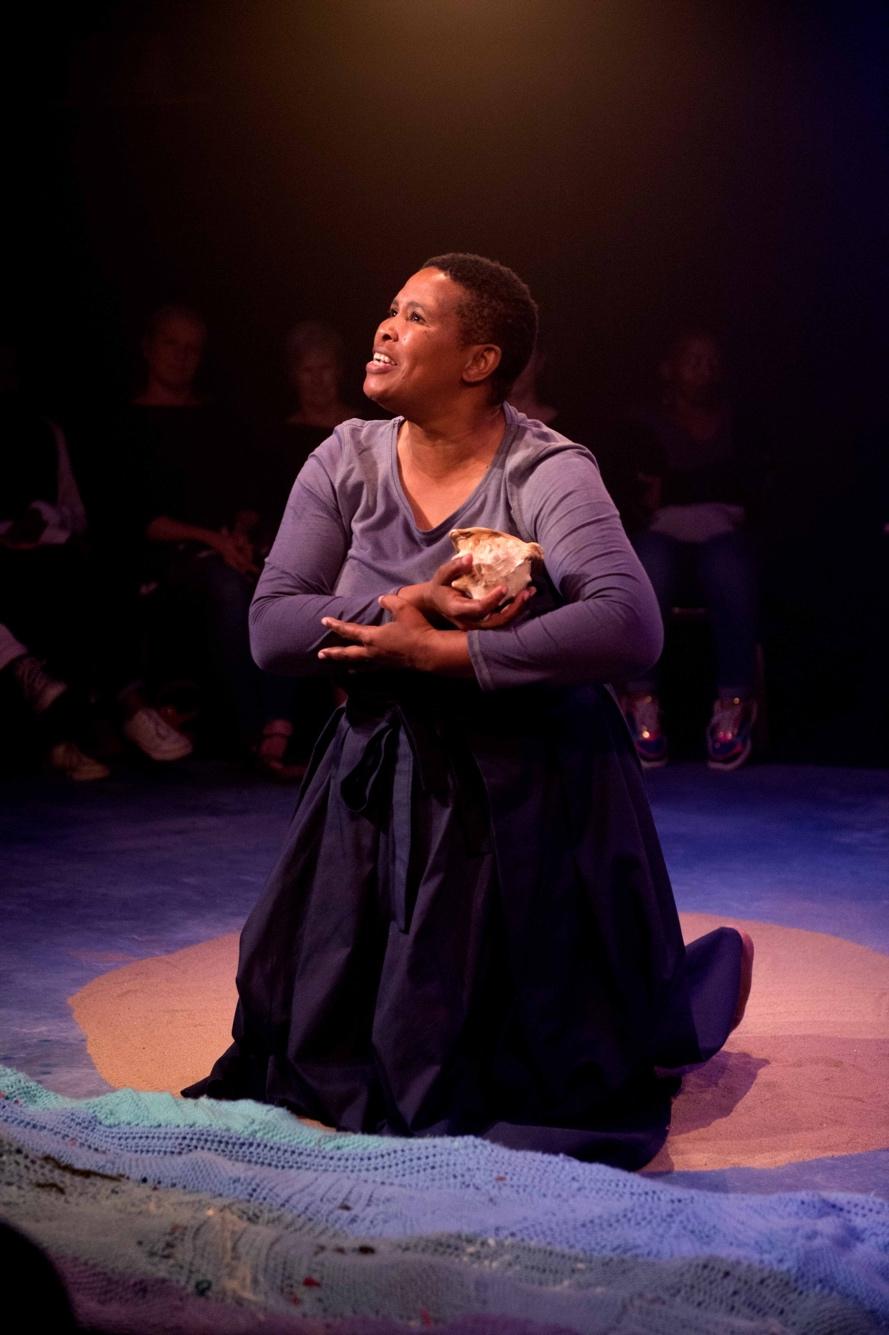 The stories featured in Lalela uLwandle recount how the ocean is linked to various livelihoods, medicine and healing, scientific awe, study and wonder, and to spiritual connections with ancestors and our loved ones who have died. In the telling it deals explicitly with acts of past and present power and exclusion in South Africa. Mpume Mthombeni as Nolwandle in a powerful scene from the production. Pic by Retha Ferguson.