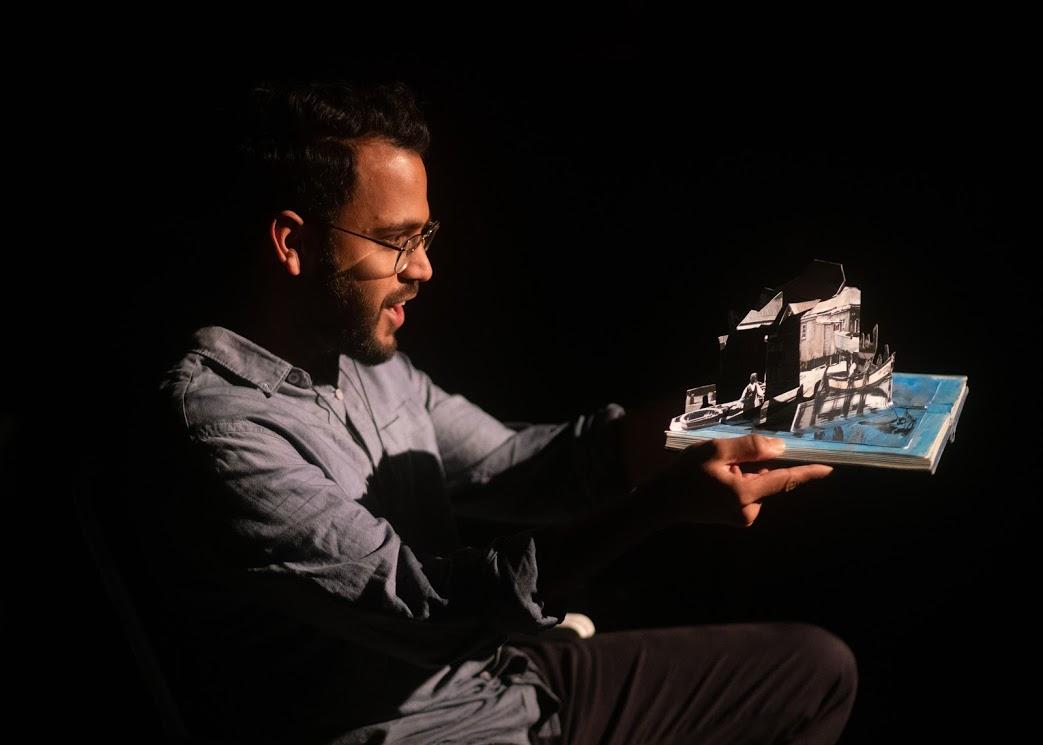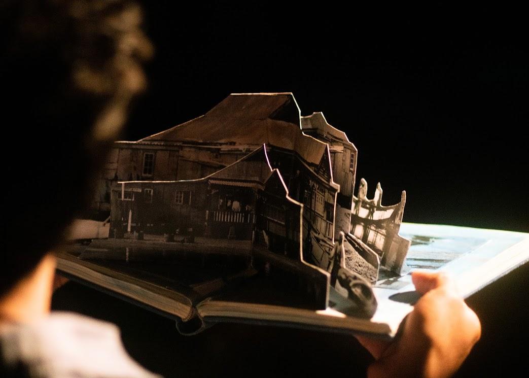 Niren (Kiroshan Naaido) reveals a pop-up version of his great grandfather’s fabled home during a performance of Lalela uLwandle at the Theatre Arts Admin Collective in Cape Town, 2019. Dylan McGarry meticulously created the pop-up house/book from original archive pictures of Salisbury Island fisher folk homes. Pic by Retha Ferguson.
