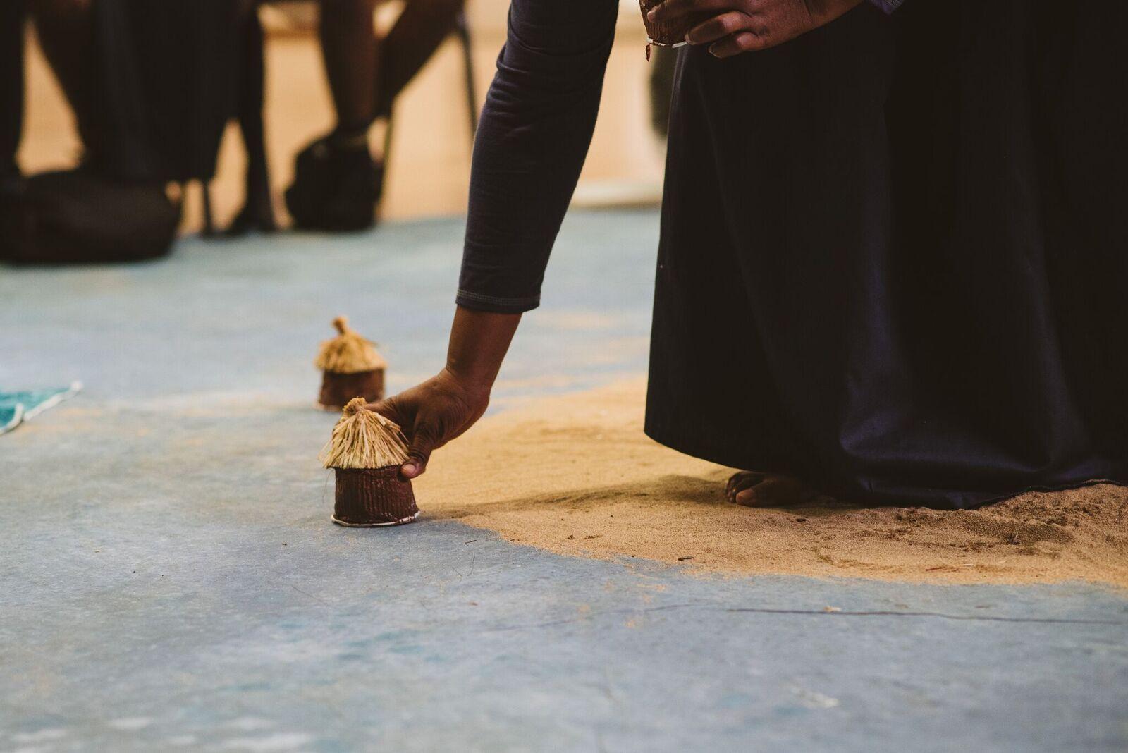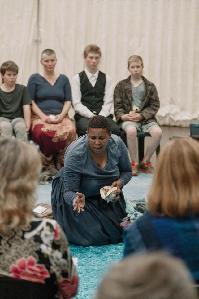 The rest of the actors in the circle, pick up their shoe boxes filled with shells and rattle them noisily. Music rises in intensity. Nolwande (as Gogo) lets out a wail, collapsing to the ground clutching handfuls of sand. Silence.