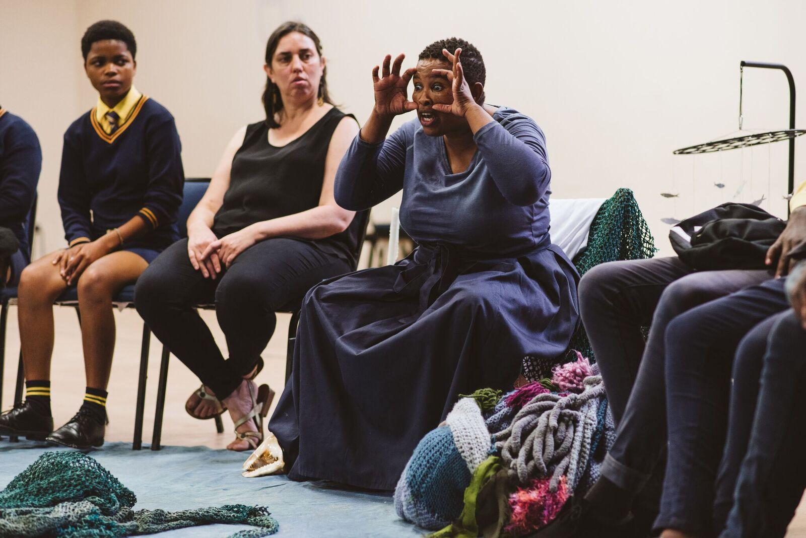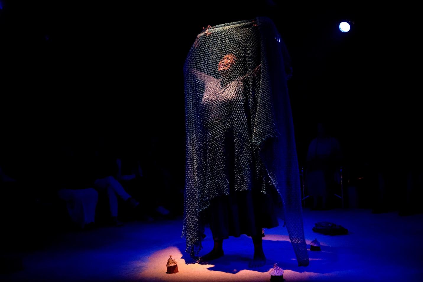 Nolwandle (Mpume Mthombeni) nets a mythical ocean creature in a scene from Lalela uLwandle. Theatre Arts Admin Collective, Cape Town 2019. The fishing net used in this scene would later come to double as a fence that separates Nolwandle’s grandmother from the sea. Pic by Retha Ferguson.