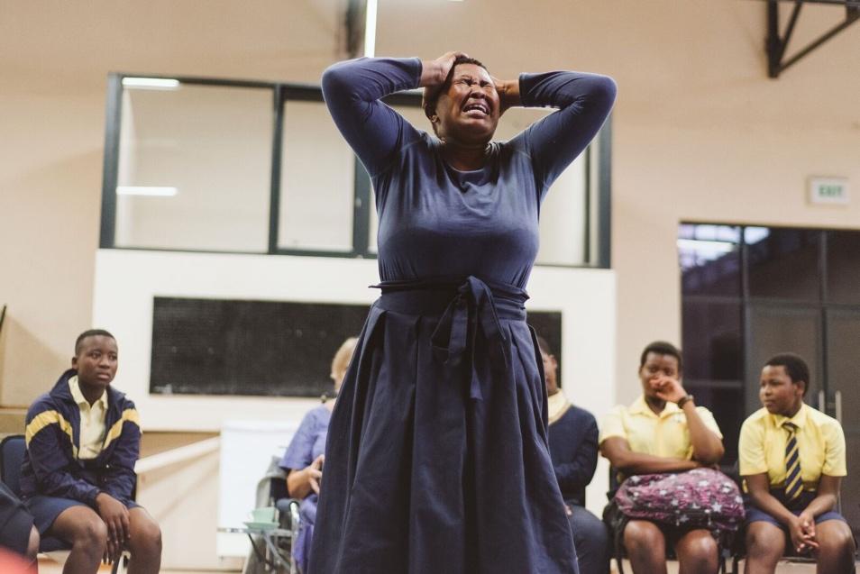 Mpume Mthombeni as Nolwandle’s Gogo, discovers mining machinery destroying her beach during a performance of Lalela uLwandle for high-school students in Zululand, 2019. Pic by Casey Pratt.