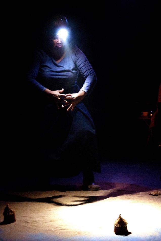 Nolwandle rises wearing a pair of oversized black gumboots and a mining helmet with search light attached. We hear the rattle of mining machinery and heavy duty trucks. She stalks the circle and begins crushing the little homestead miniatures beneath her boots. Once she has destroyed the village, she then transforms into the grandmother character, setting eyes on the scene for the first time.