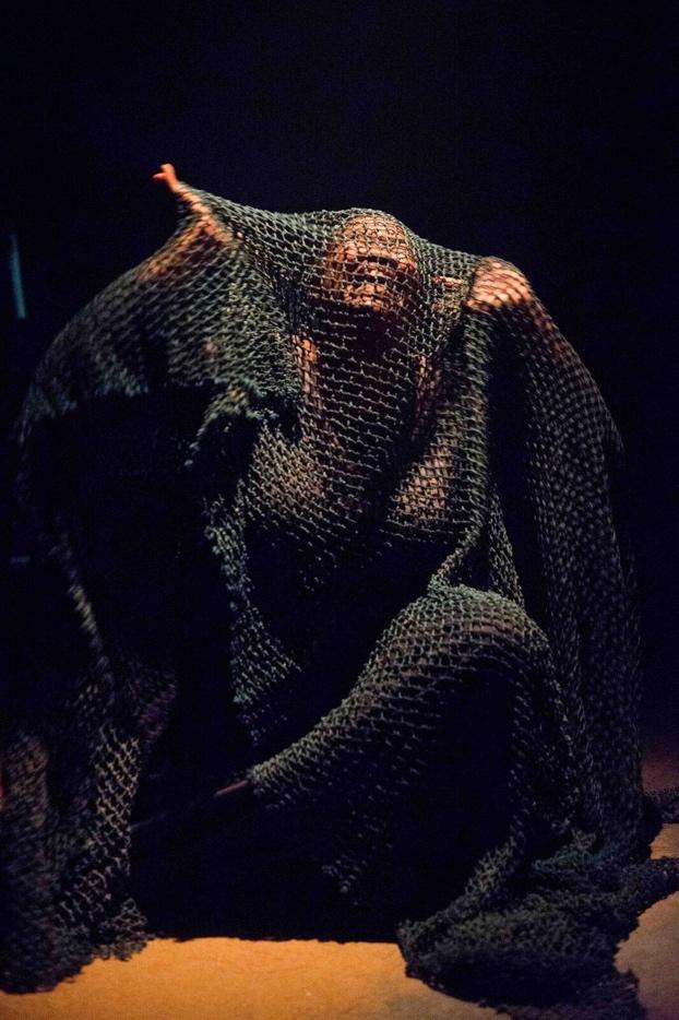 Nolwandle (Mpume Mthombeni) recalls how her Grandmother was forbidden from collecting muti along the coastline in a scene from Lalea uLwandle. Here the fishing-net from earlier scenes doubles as a fence ensnaring humans in its web. Pic by Val Adamson.