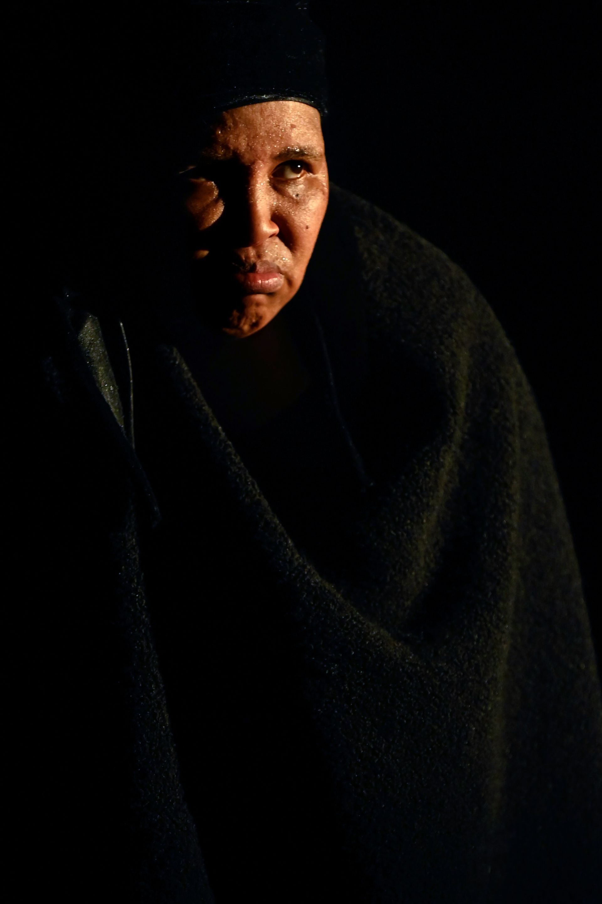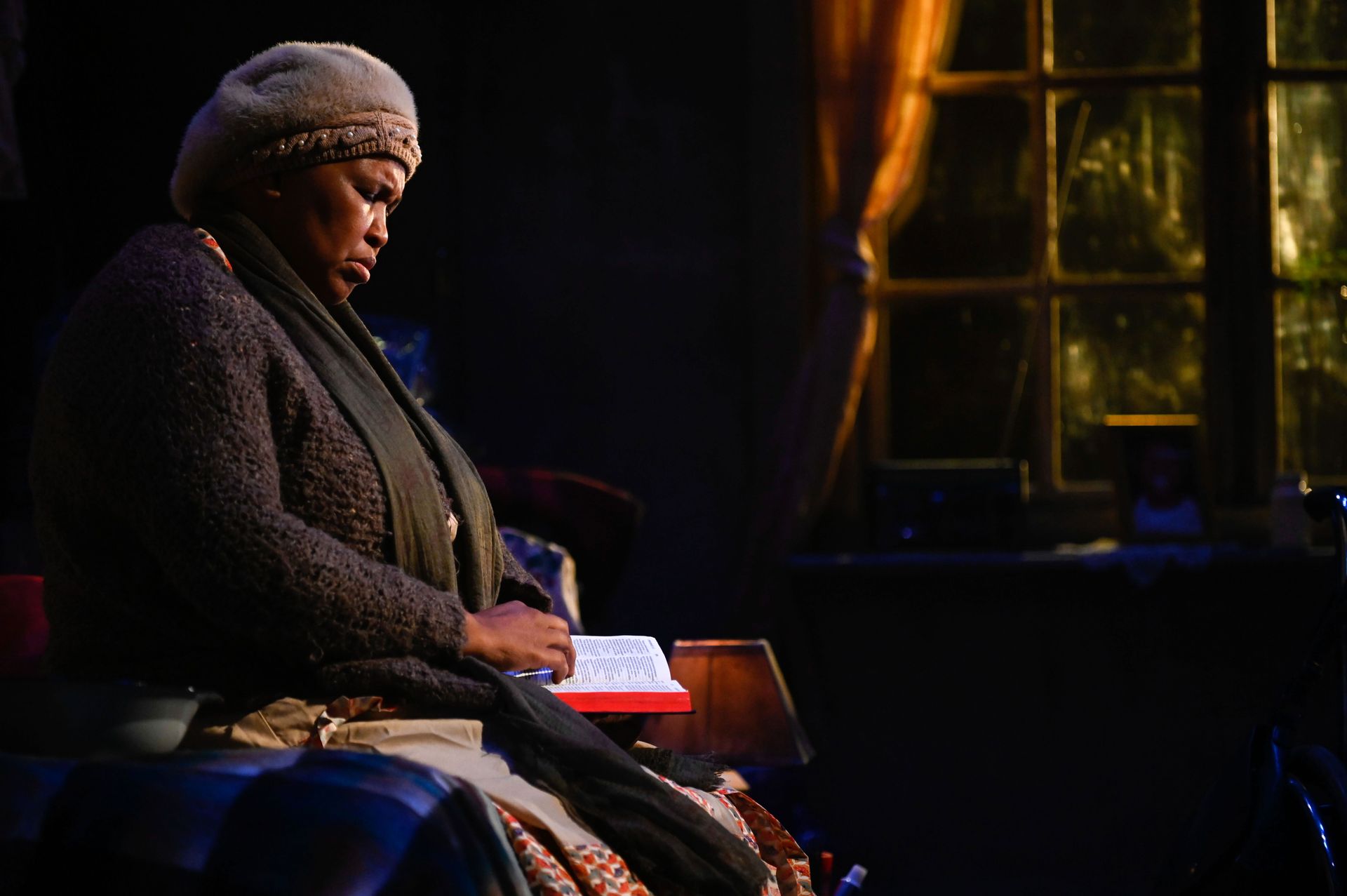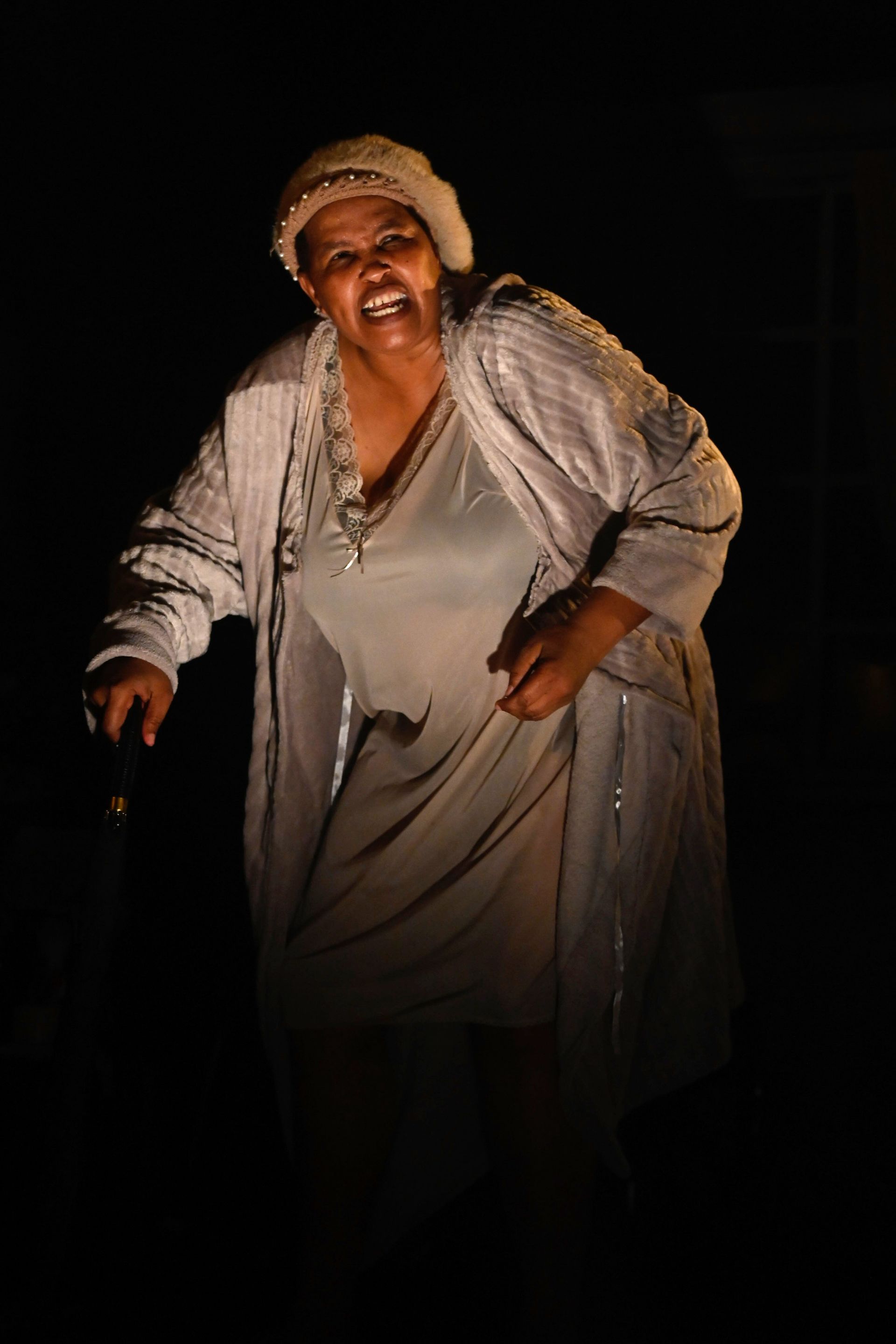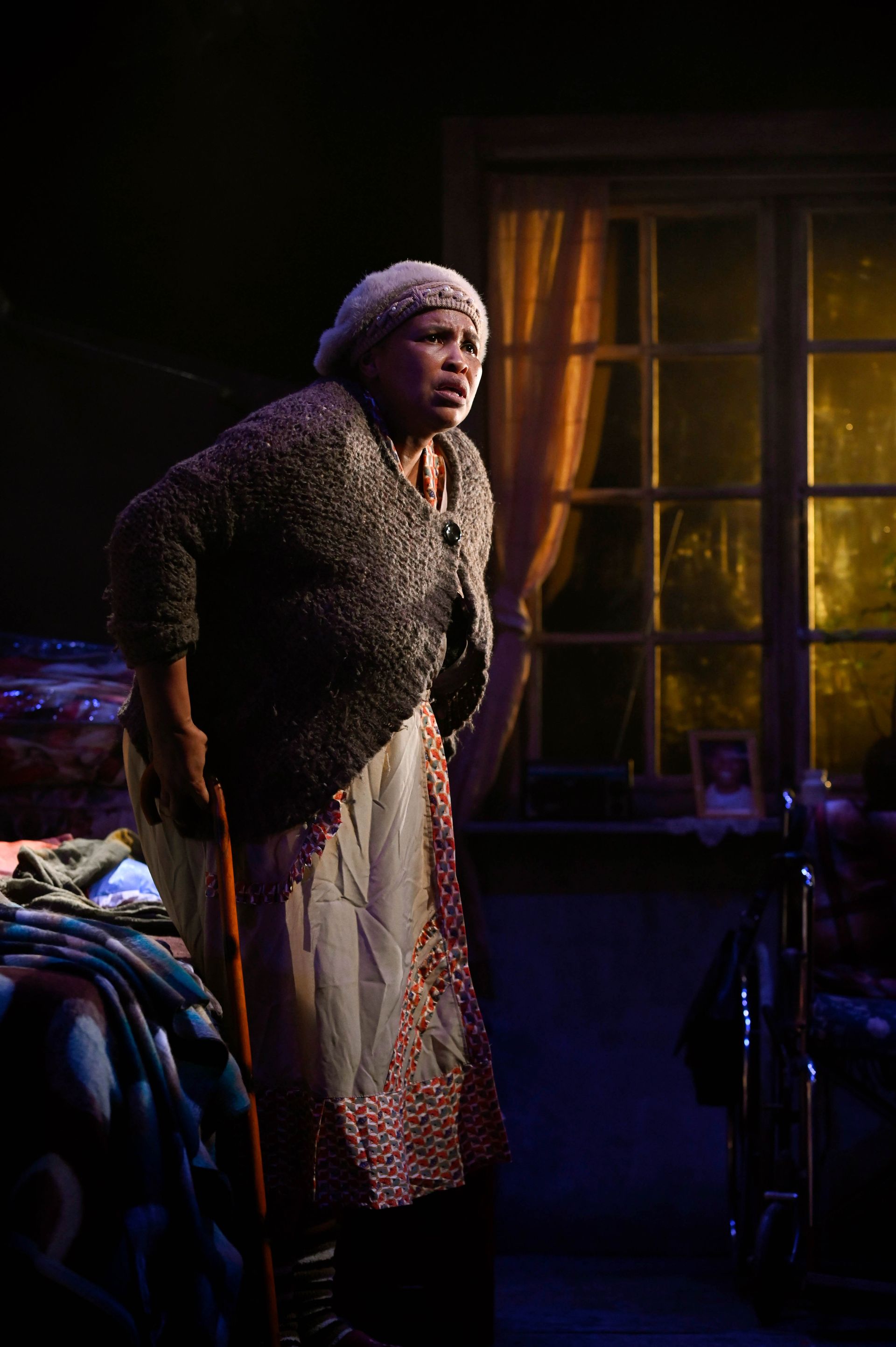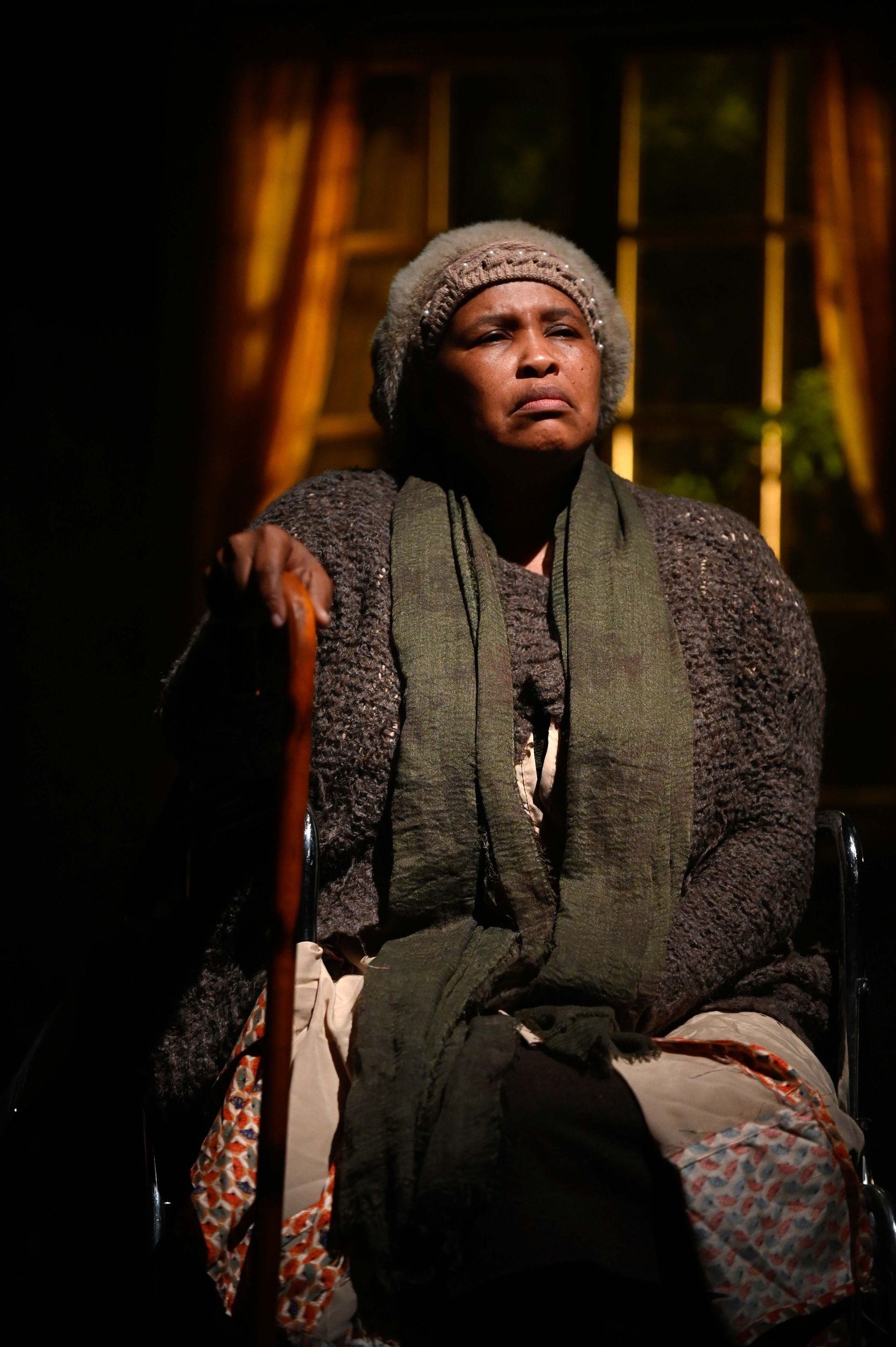 A rumble of thunder again as the storm circles back for its final crescendo. Zenzile means business. She grabs her purse and a black umbrella and pushes the wheelchair angrily into position, cursing in isiZulu as she goes. Lights shrink around the scene as she takes her seat for a final showdown with Pink Nails.