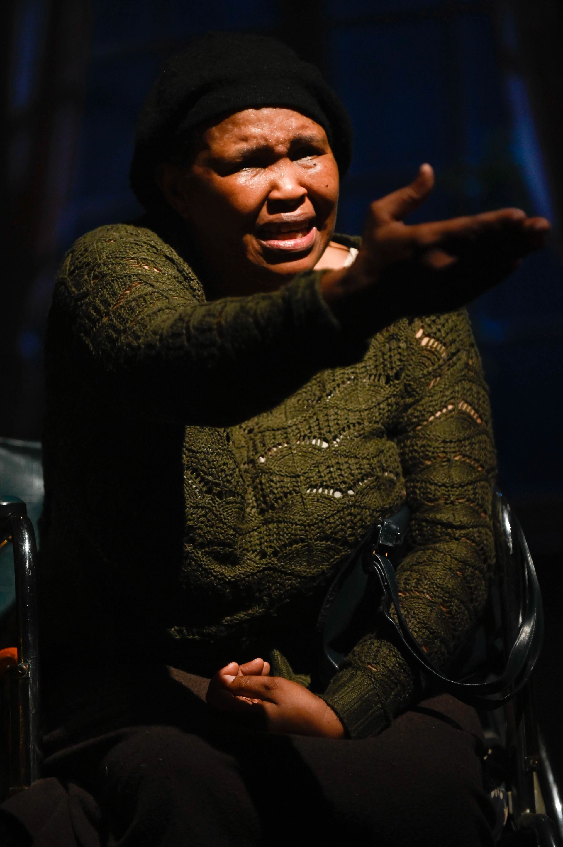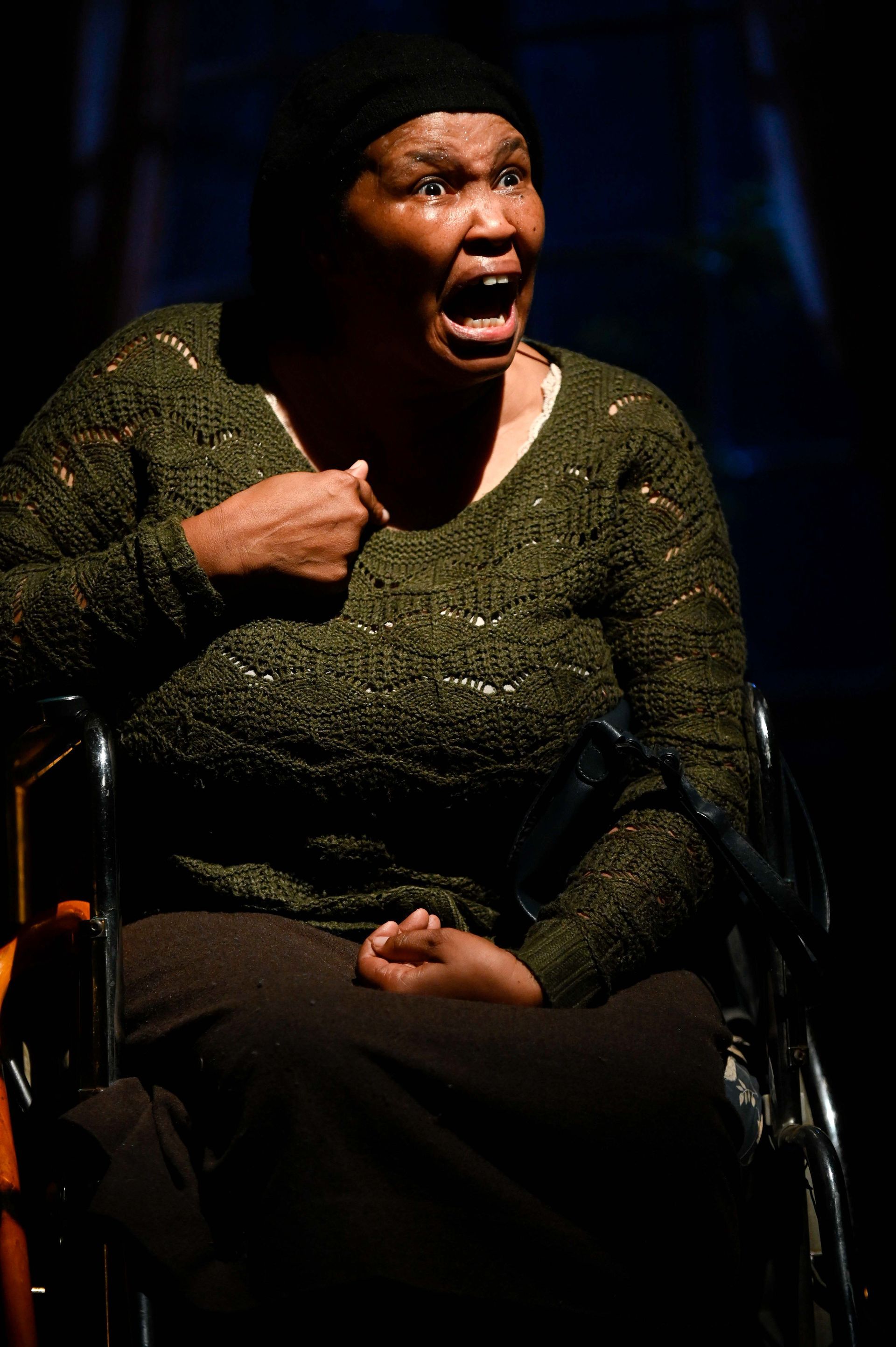 Lightning strikes… Zenziwe’s tone shifts to that of a preacher mid-sermon. She rises from her wheelchair and pushes it to one side, claiming all of the playing space.