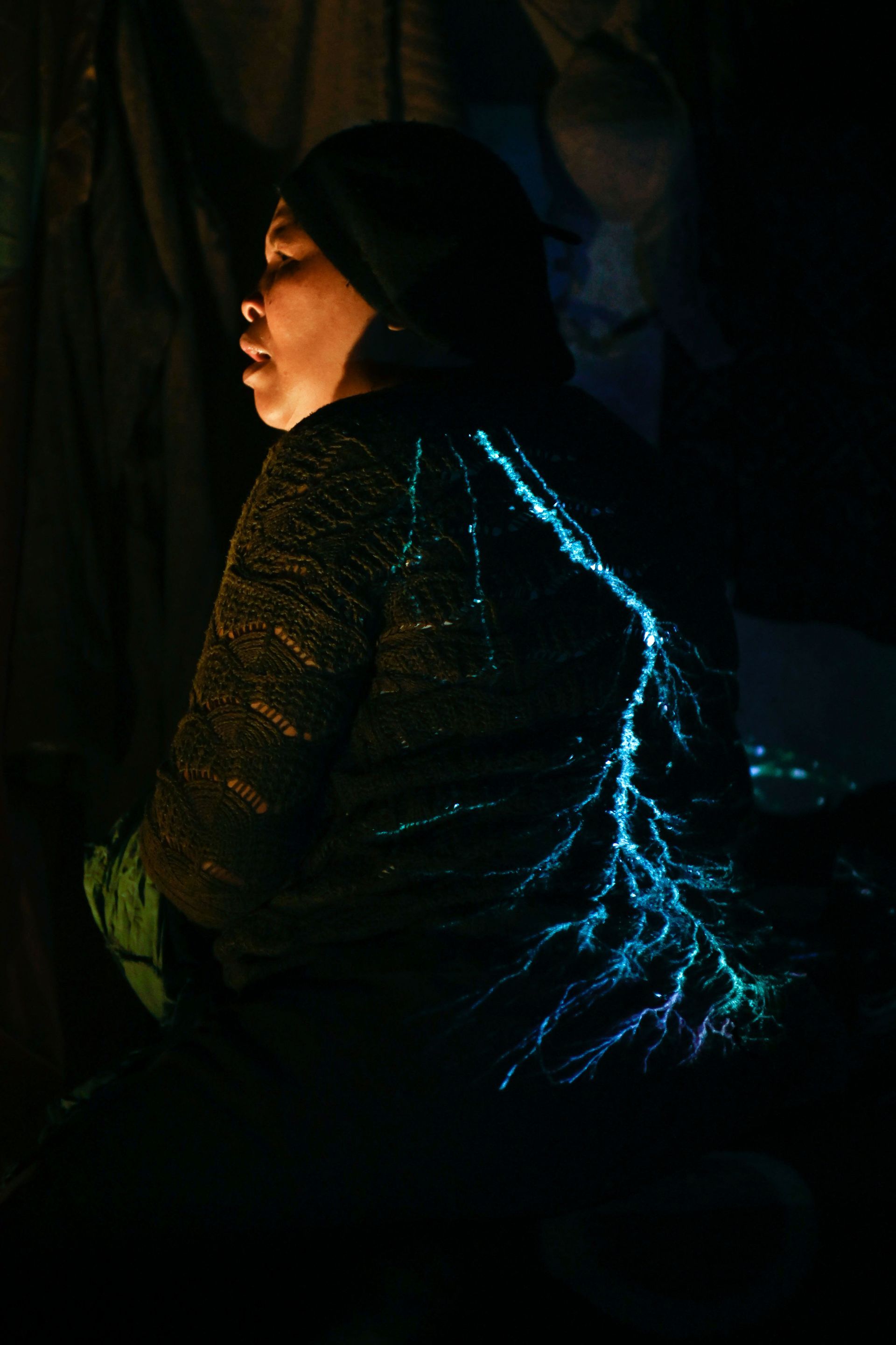 She turns away from the audience, stroking an imaginary serpent. The lightning scar stretches and glows across her back for a final moment, mirrored by the image of the sapling branches center stage.
