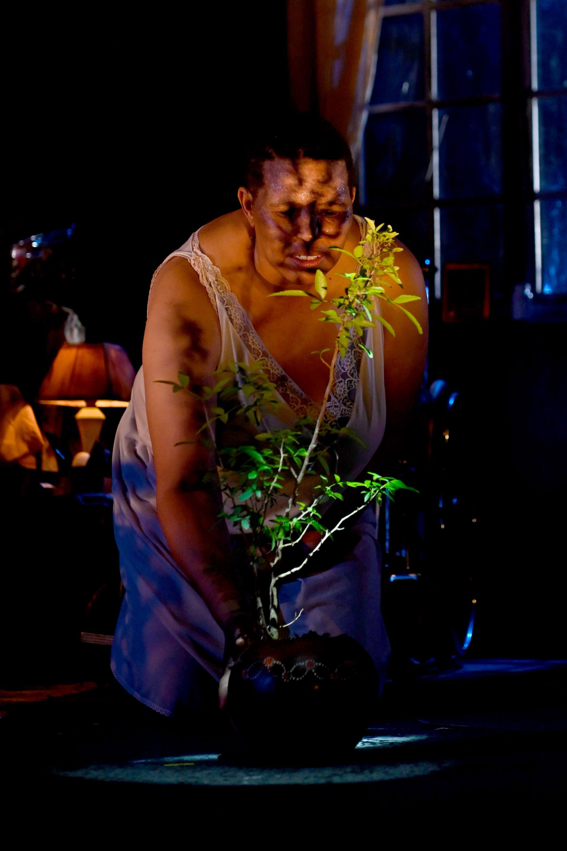 And if Unkulunkulu… you see that she is lonely and you take pity on her….she will offer you one of her ribs…but on one condition: that you send her another woman and not some useless man. (Zenzile-- as if her request has been granted-- slides off her dressing gown and hugs the garment close to her, breathing in its scent deeply before tucking her heaven-sent companion into bed.) Then, when that soil is ready, she will plant her gogo’s tree back in the earth. (She cradles the monkey-apple sapling in her arms before kneeling to place it centre-stage on the ground) She will mix up that special recipe…caring for it until it bears the first fruits…so that life may begin again, and life may return.