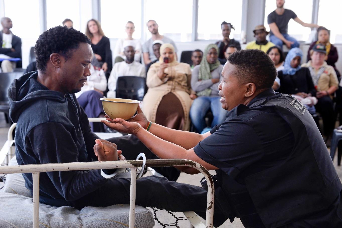 Over the duration of its five year run, Ulwembu was performed at a range of drug policy conferences, community meetings, church halls, open-days, homeless shelters, rehabilitation centres, universities, state-of-the-art theatres, suburban art-galleries, and on one occasion, a children’s playground with the jungle-gym net improvised into the blocking of the play. In this image, Portia (Mpume Mthombeni) attempts to get her son Sipho (Zenzo Msomi) to eat. The Handcuff scene is inspired by true events, where a desperate mother-- to protect her son from the community’s outrage-- handcuffed him to a bed for a month. Denis Hurley Centre community performance. 2016. Pic by Val Adamson.