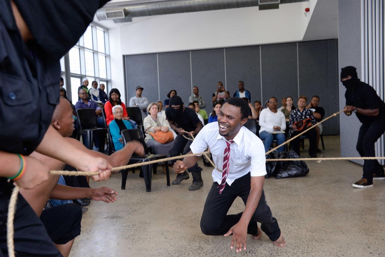 Ropes wielded by the cast, tighten around the waist of Sipho (Zenzo Msomi). The image helped us reveal the invisible pain caused by the side effects of the drug known as Arosta, but also to the interconnectivity of our community, and how the pain of one person will ultimately influence someone else. If we want to respond to drugs effectively in Durban, we need to respond to it collectively. Here the audience (a gathering of family members, health practitioners, users, and the police) watch the downward spiral of Sipho and Andile. Denis Hurley Centre Performance 2016. Pic Val Adamson.