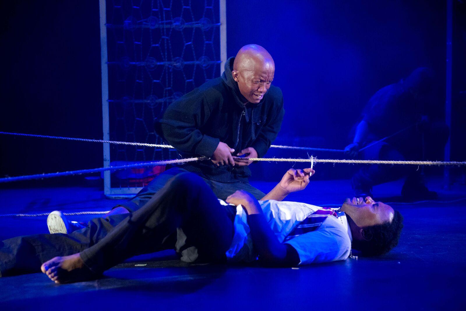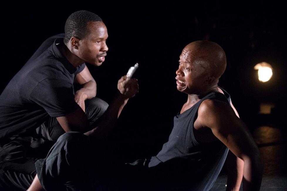 o achieve the arosta image, we began to experiment with two long ropes, held on either end by cast members, rising and ravelling around the belly of the narrating whoonga-using character. As the user’s cramps worsened, the company would encircle the character, pulling more tightly on the ropes as they went. This image not only articulated the harrowing physiological sensation experienced by whoonga users, but also suggested an arachnid spinning its victim deeper into the threads of its web. Here Andile (Ngcebo Cele) and Sipho (Zenzo Msomi) desperately try to rid themselves of the intensifying pain. Playhouse Loft 2015. Pic by Val Adamson.