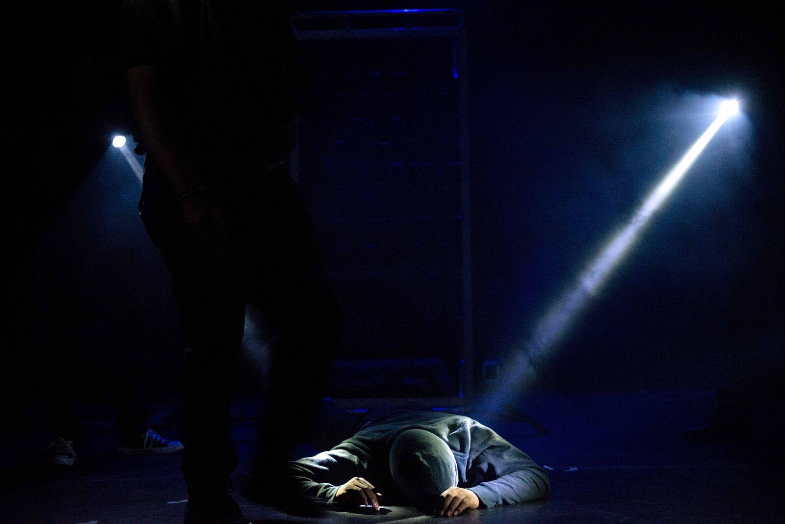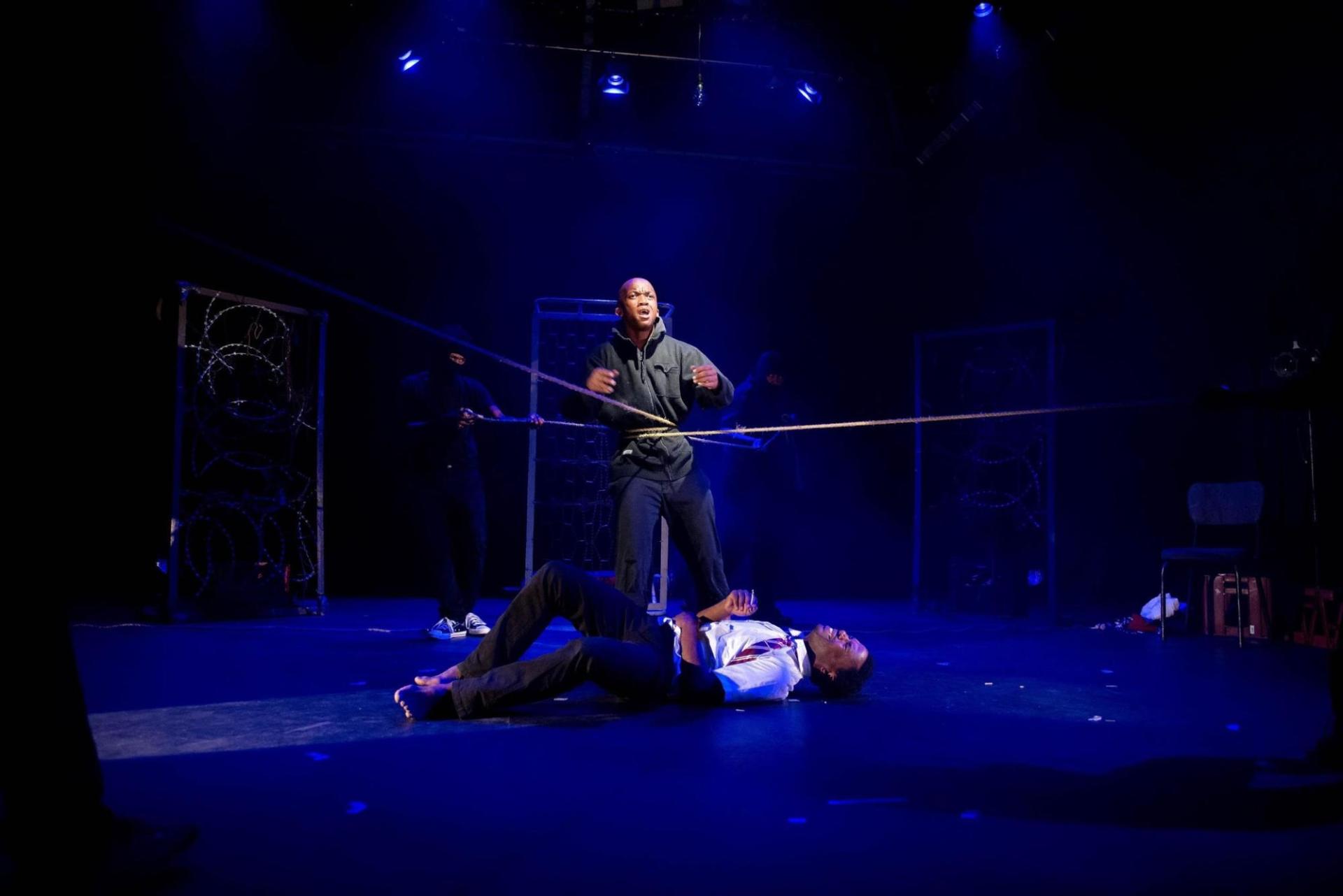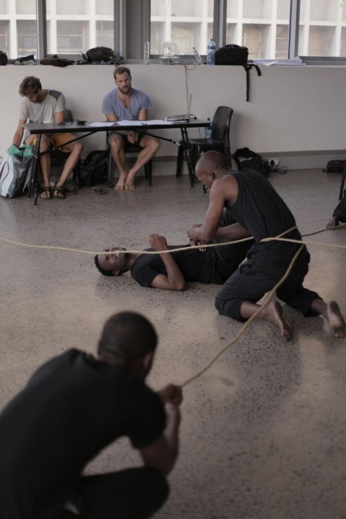 The company, wearing balaclavas, slowly enter the stage and circle ominously around Andile wrapping long pieces of rope around his belly before moving to positions on opposite corners of the stage. As their grip gradually tightens, the ropes fasten painfully around Andile’s stomach. Sipho watches on.