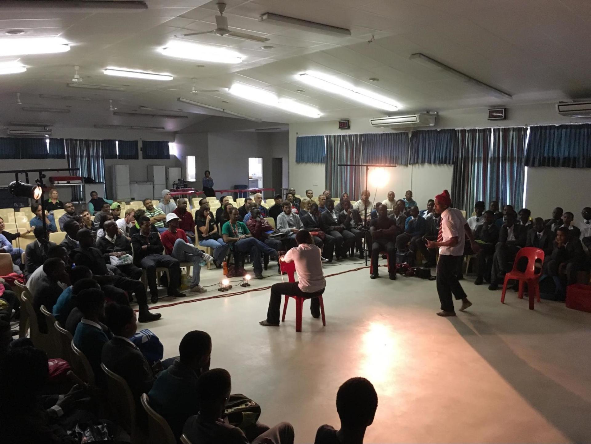 A scene from a public performance of Ulwembu at the Edendale Rehabilitation center in Johannesburg. During this performance at a center used for rehabilitation work in Edendale, Johannesburg, our audience included police, a wide range of users enrolled in a rehabilitation program and high-school learners from a nearby school. In this particular session the actors and facilitator took a backseat allowing for a conversation to occur more directly between the learners and recovering users in the audience. In this instance, a range of impassioned recovering users assumed the role of facilitators and educators, answering a variety of questions posed by the learners and members of the police, while using the plays characters and narrative as a means to prompt and reflect on their own experience with addiction.