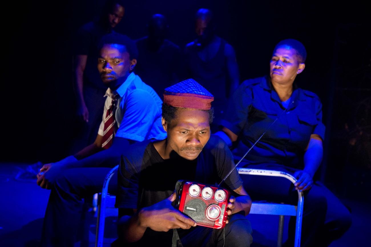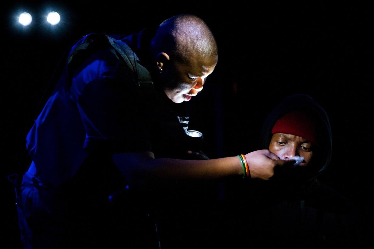 Whoonga dealer Bongani (Vumani Khumalo) faces off with policewoman Portia Mthembu (Mpume Mthombeni) in a tense scene from Ulwembu. Although Bongani had emerged from various interviews with dealers around Durban, the character’s real-life counterpart was identified by Mpume who, in the early stage of her research, began to interview a member of her community in Umlazi. Mpume had grown up in the same neighbourhood as the informant and this familiarity enabled her to deepen her friendship with him while breaching difficult topics in the interview process. As Vumani began to take ownership for the Bongani character, any further queries around his life story would be posed to Mpume who, after rehearsals, would revisit her neighbour and return the following day with further insights.