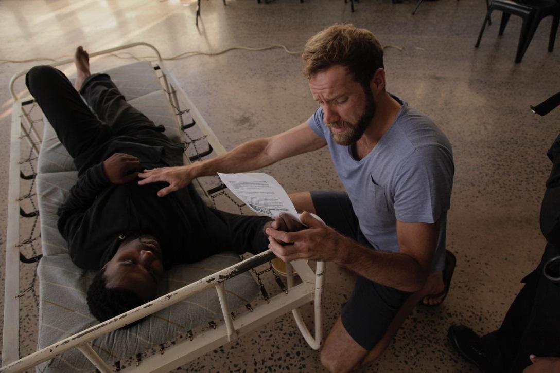 Ulwembu is a collaborative documentary-theatre project, that brings together writers, theatre-makers, citizens and civil society to engage the interface between street-level drug-addiction, policing and mental health in the city of Durban, South Africa. Here director and co-writer Neil Coppen talks Zenzo Msomi (Sipho) through a difficult scene. Denis Hurley Centre rehearsal Room 2015. Pic by Colwyn Thomas.