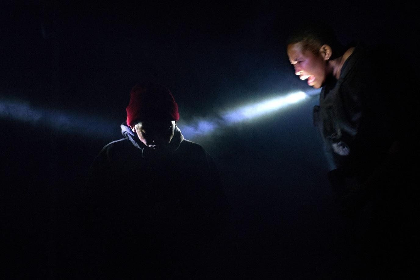 Ulwembu is not merely a precautionary play that aims to ‘scare’ young people into not using drugs. The life of a whoonga user is scary enough; there is no need to add to that horror. Instead the production goes beyond intimidating audiences into avoiding drugs, but rather revealing the entire world of drug use in the city, and to create an engrossing, emotive and honest experiences for audiences, that speak to the realities of why people begin to use drugs in the first place. Zenzo Msomi (Sipho) in rehearsal with Mpume Mthombeni (Portia) at the Denis Hurley Centre 2015. Pic by Colwyn Thomas.