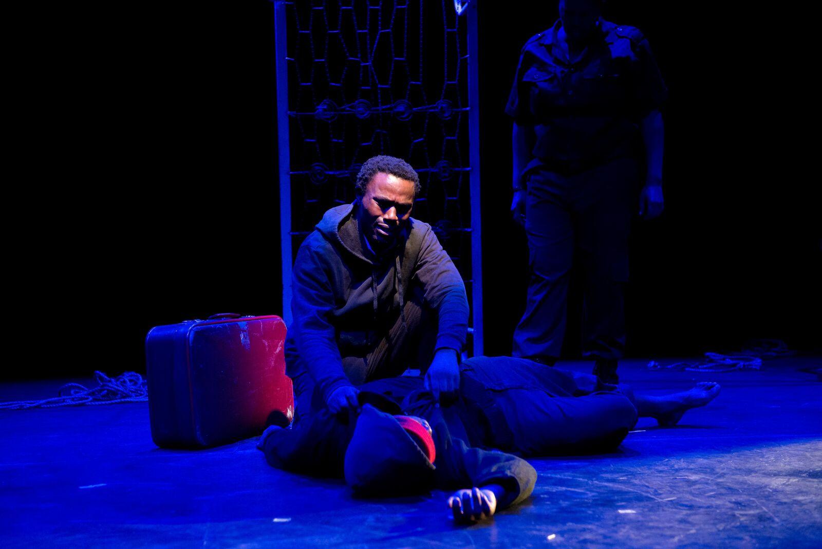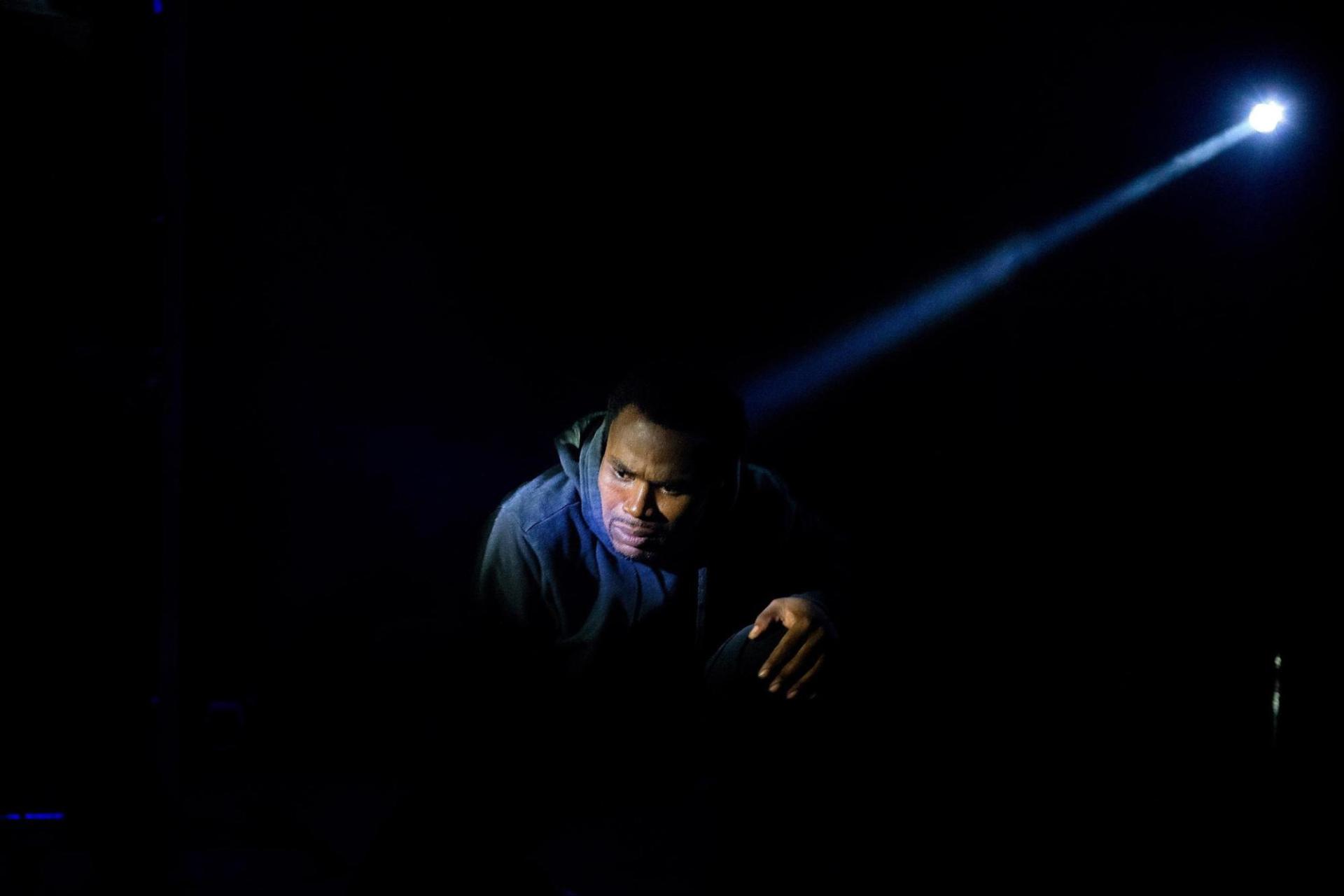 Sandile Nxumalo as Mozambiquan character Emmanuel in a scene reflecting on the xenophobic attacks in Durban which were conflated with the Whoonga crisis by the attackers. The tension between foreign nationals and South Africans has been exacerbated by the complex effect Whoonga has had on Durban. Understanding this effect requires real investigation as the issues are far more nuanced and powered by many myths and half-truths. Playhouse Loft 2015. Pic by Val Adamson.