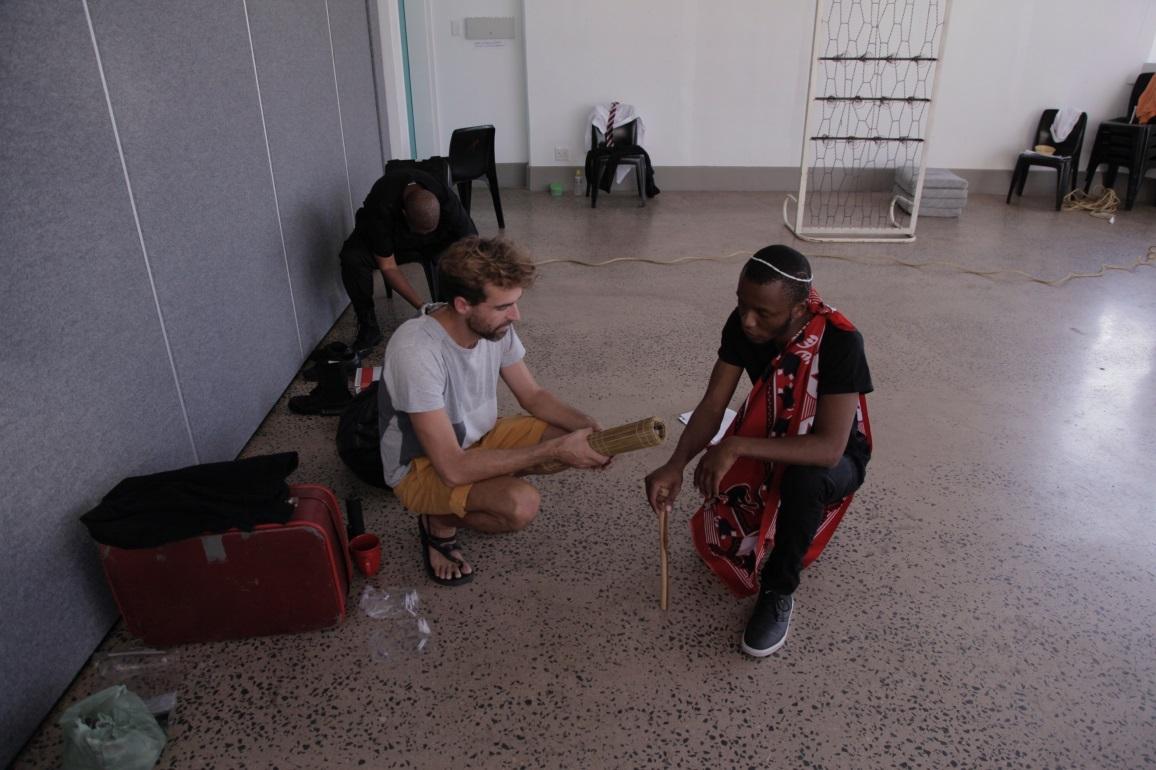 Designer/co-writer and sociologist Dylan McGarry working alongside Menzi Mkhwane at the Denis Hurley Centre rehearsal Room. 2015. Pic by Colwyn Thomas.