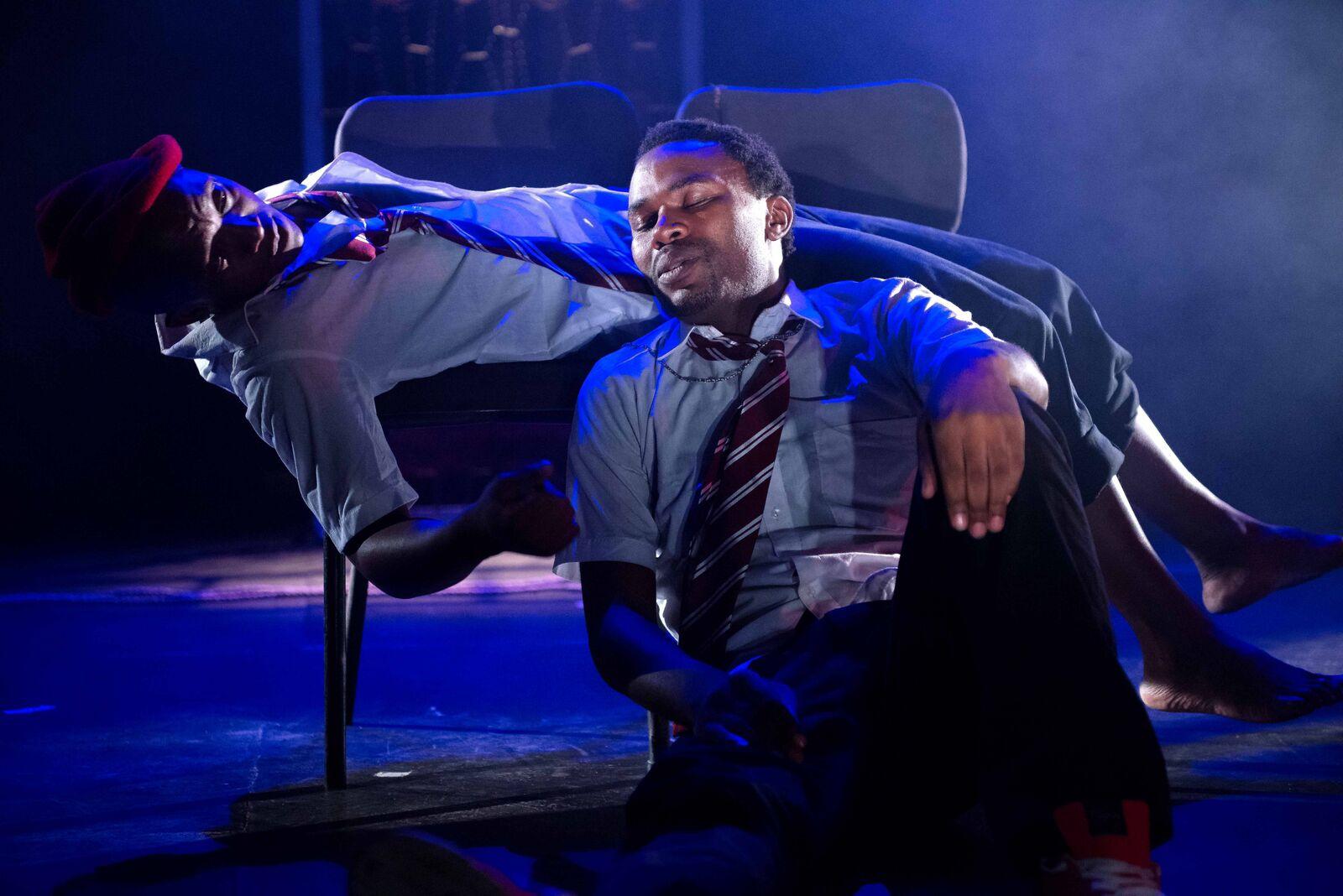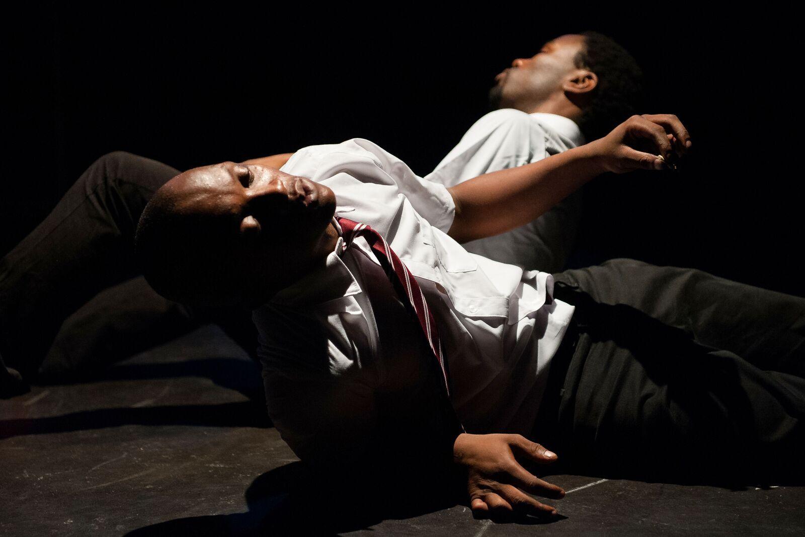 Ngcebo Cele (Andile) and Zenzo Msomi (Sipho) embodying the painful cramps known as "Arosta". Playhouse Loft 2015. Pic by Val Adamson.