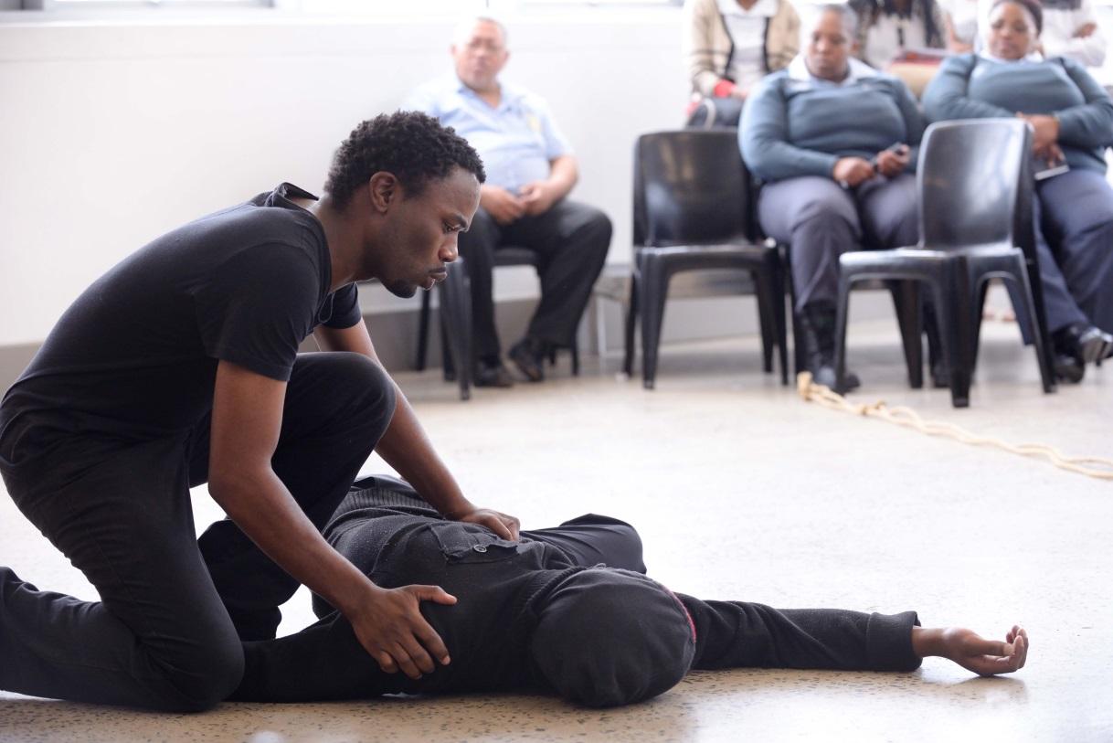 To learn more about the pathways out of Drug use, we set a new research task, which involved the actor-ethnographers heading out into their communities and searching for inspiring narratives of users rehabilitating from whoonga use and successfully integrating back into society. Such narratives were, however, few and far between. Rather, we discovered that a range of approaches would need to be acknowledged as the ‘solution’. In this scene Zenzo Msomi (Sipho) discovers the body of Andile (Ngcebo Cele). Playhouse Loft 2015. Pic by Val Adamson.