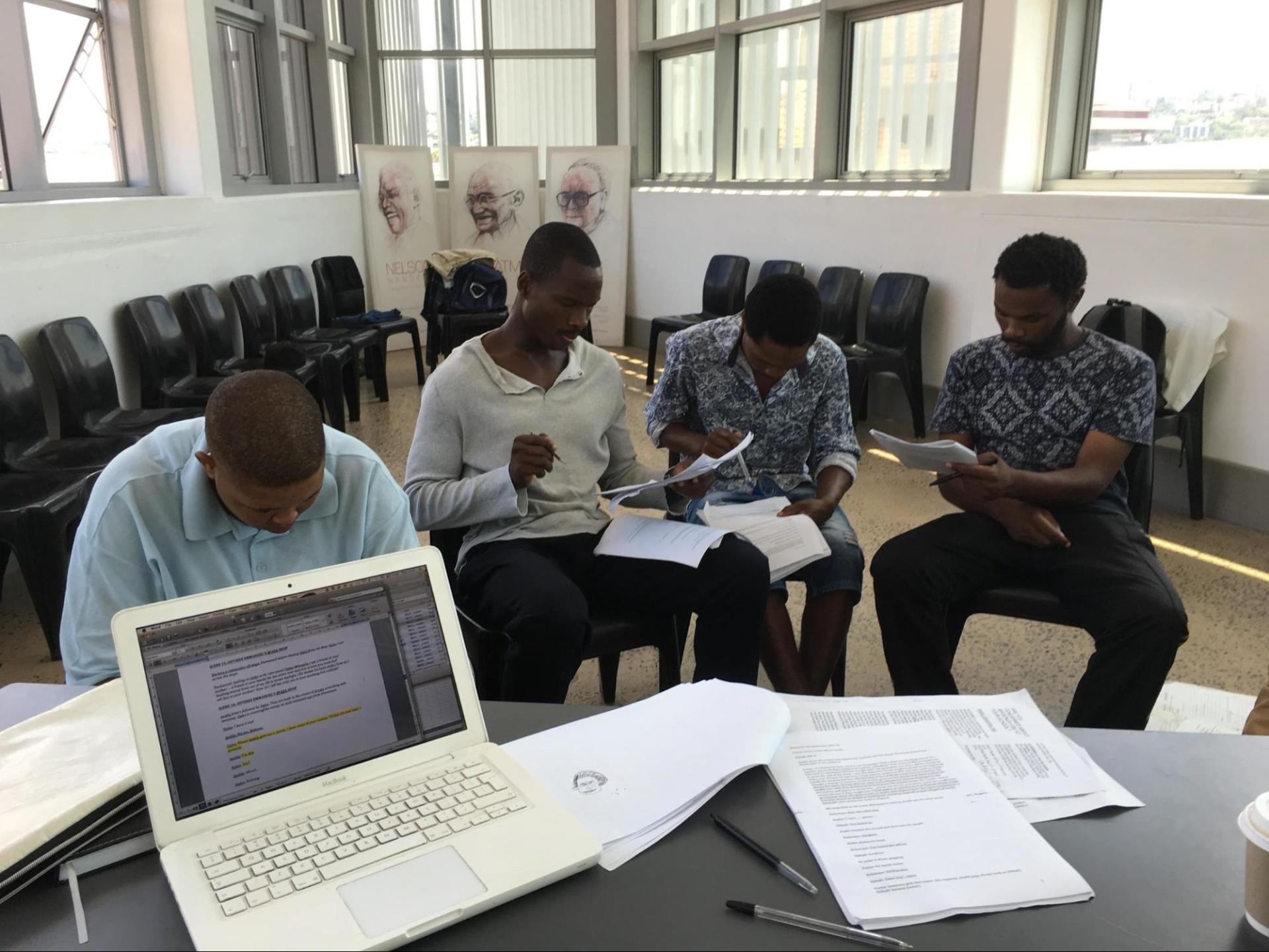 Before embarking on the research for what would come to be called Ulwembu, Dylan—drawing on his sociological academic background—guided the team through a discussion on the ethics behind participant observation and generative reflexive research techniques. Other areas covered included how to document field notes and correctly translate and transcribe interviews. During these workshops, we also urged the team to work in groups of two and prioritise their safety by steering clear of threatening situations, particularly when it came to interrogating the more covert networks of whoonga manufactures and dealers. Here the team meet at the Denis Hurley Centre to reflect on their findings.